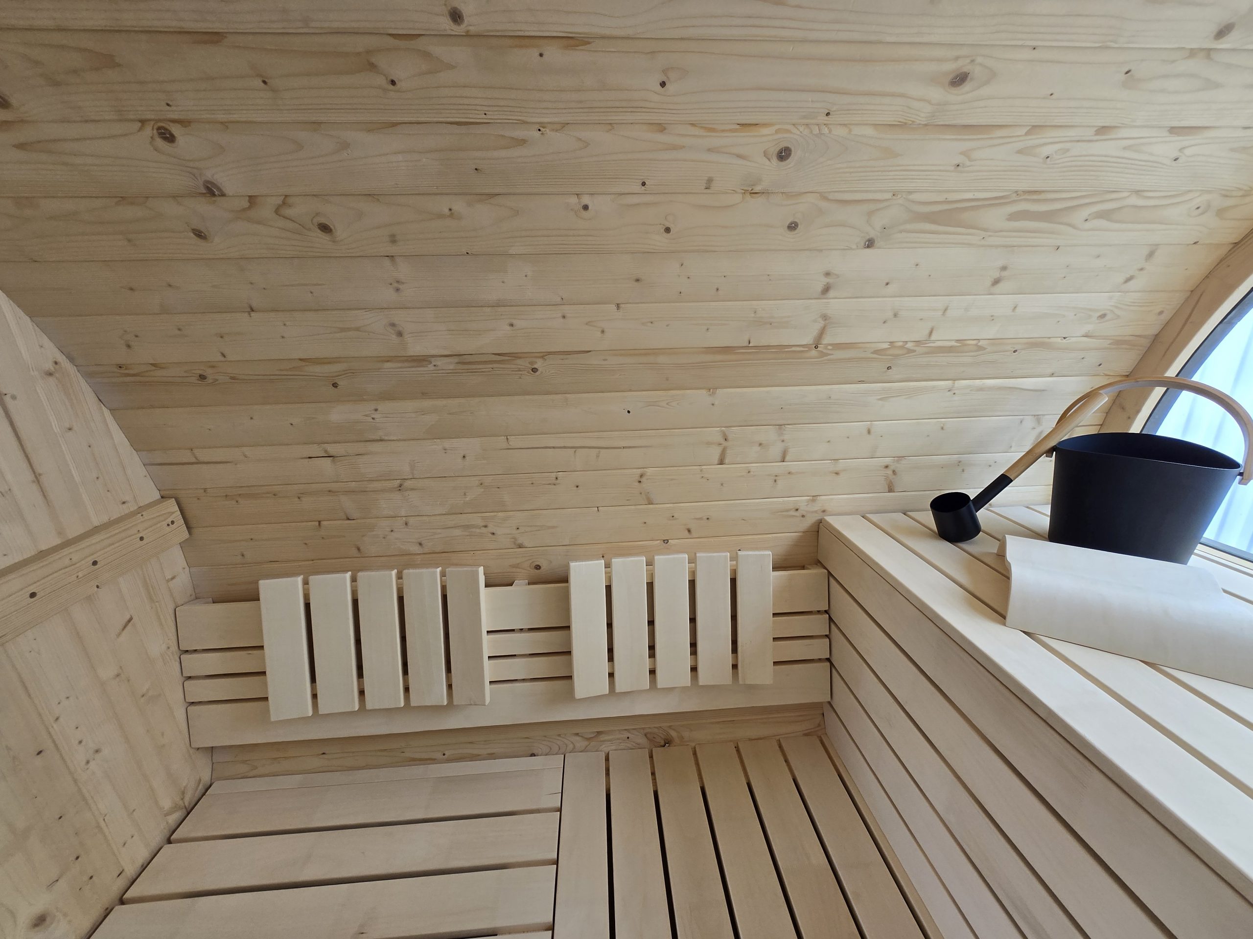 Interior made of high-quality aspen wood with floor grate, backrests, and two headrests.