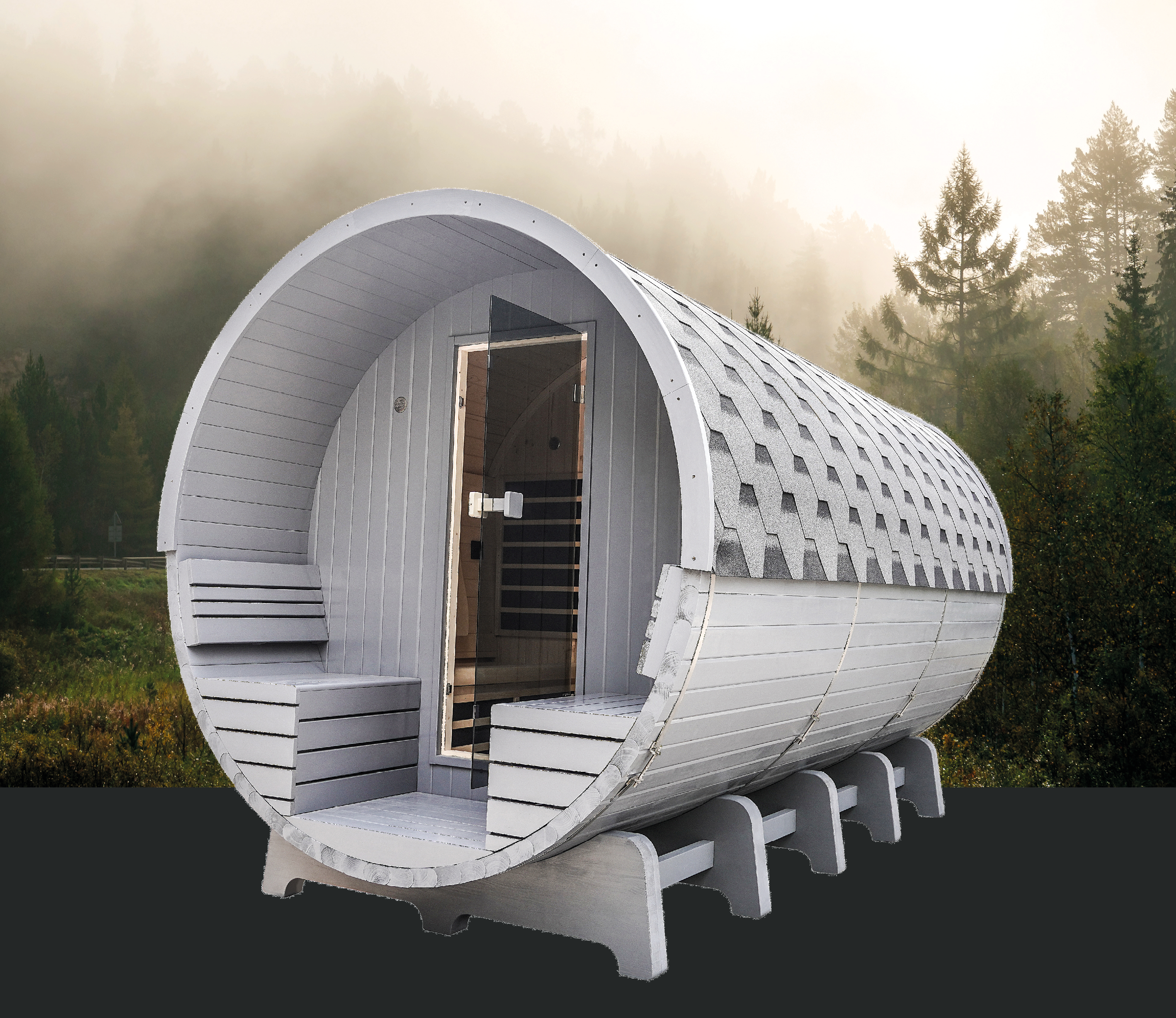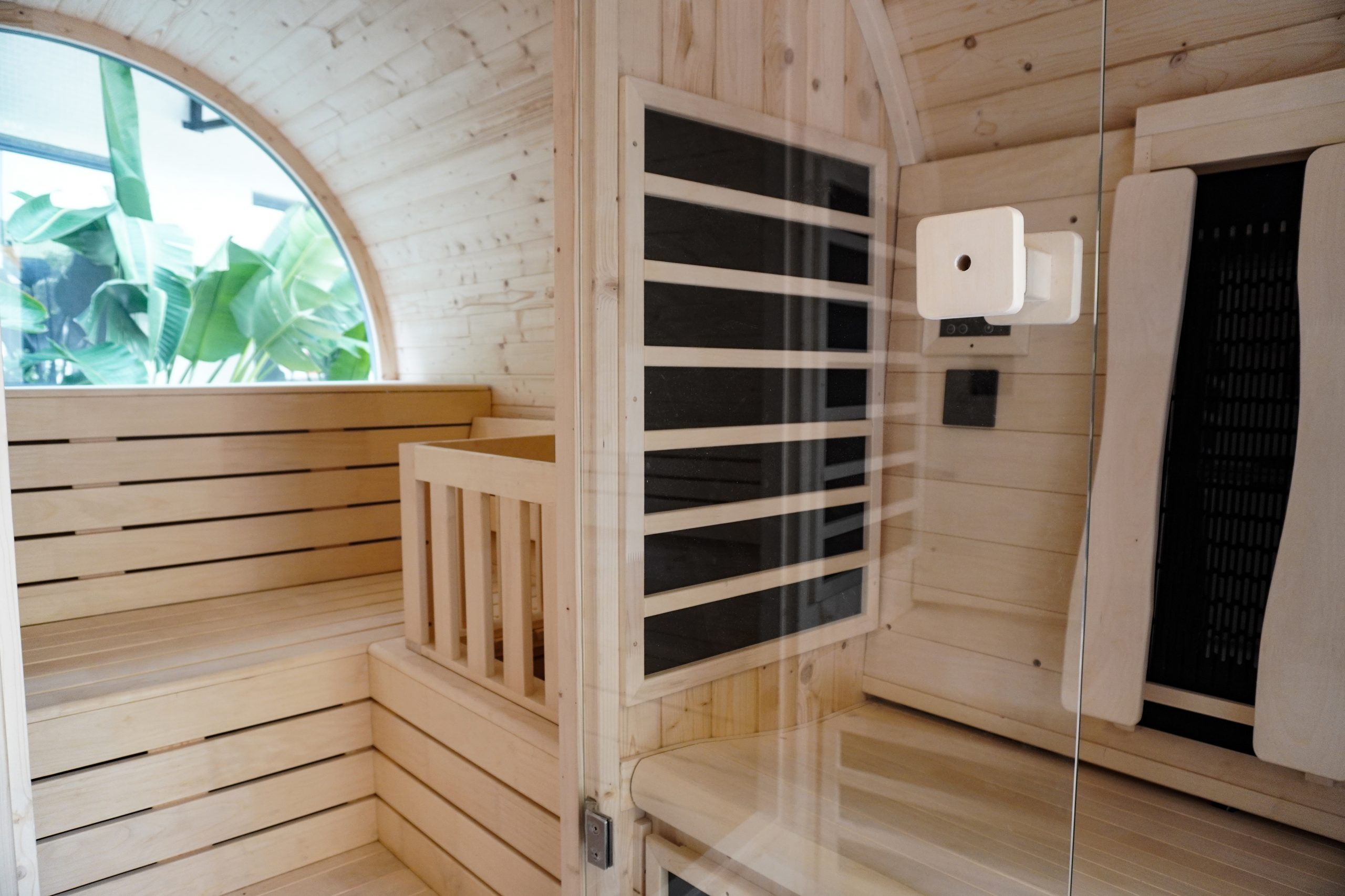The combined sauna cabin in a solid wood barrel brings relaxation and well-being to your garden: relax in the cozy atmosphere of spruce wood planks and enjoy the cleansing power of sauna and infrared heat.