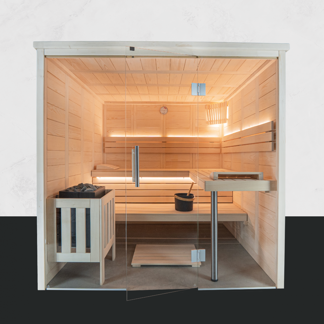 Entspannen Sie im angenehmen Ambiente der Fichtenholzbohlen und genießen Sie die reinigende Kraft der klassischen Saunawärme. Die Premium Saunakabine Atlanta View mit Lindenholz-Interior fügt sich in elegantem Design in Ihren Wellnessbereich ein.